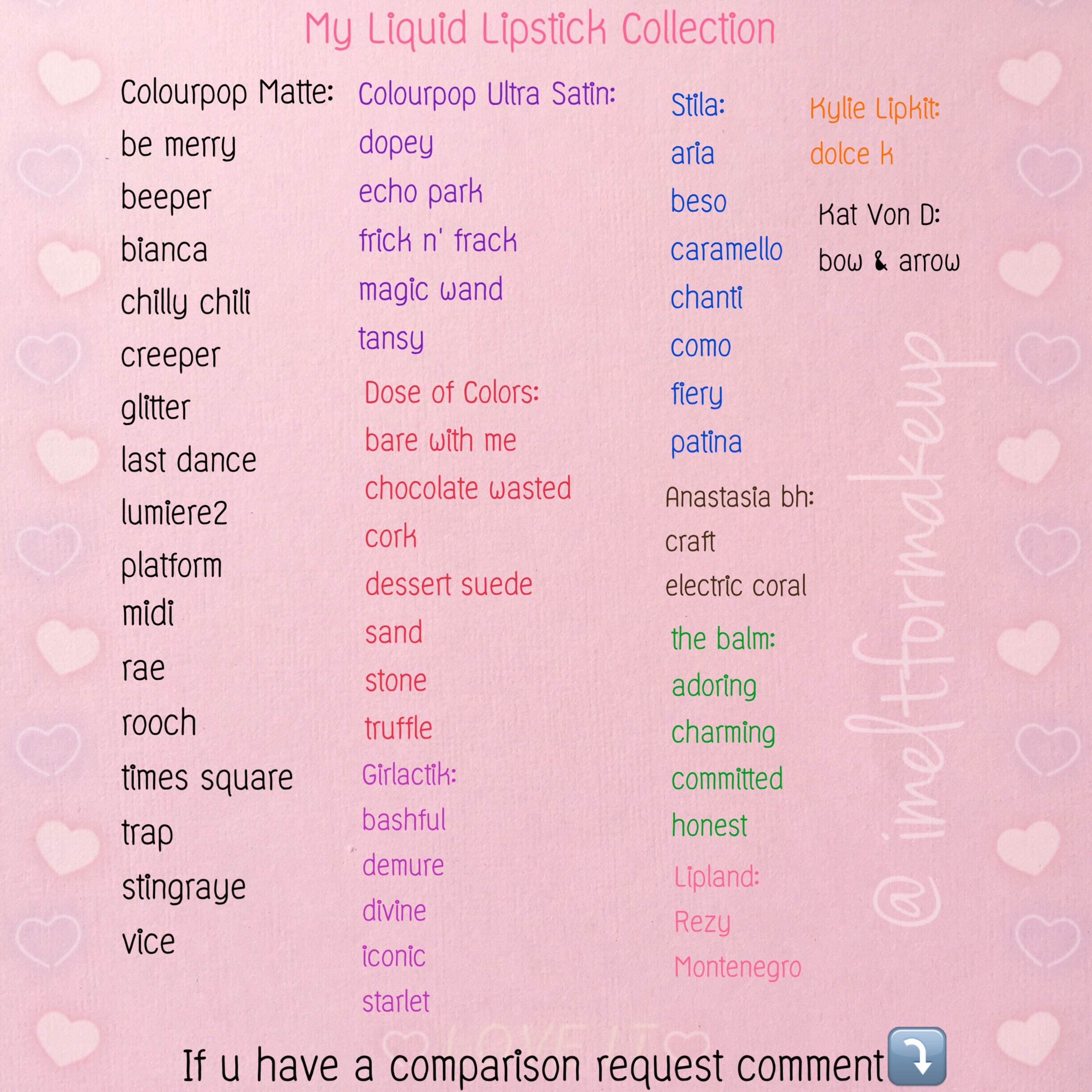 My liquid lipstick list..new additions coming soon: Colourpop mess around, jellies, dr. m, panda and lyin king. If you have comparison requests I will take pictures and DM you via Instagram @imeltformakeup