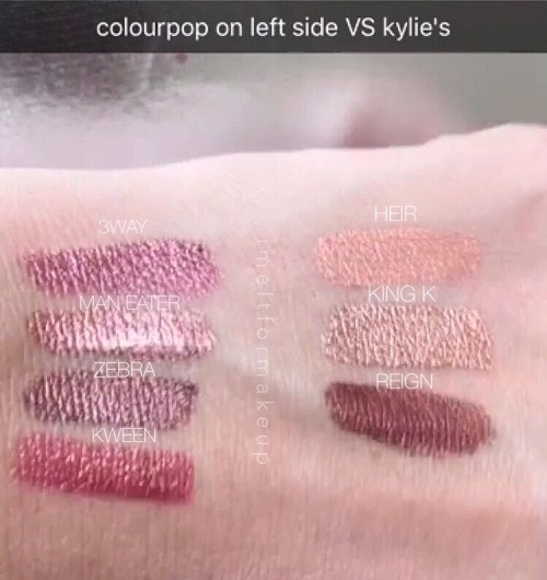 Compared to Kylie’s metals’ Heir was my least favorite because it was streaky, sheer, and didn’t show up well. I think colourpop’s version is a better kylie formulation but not top notch. As for dupes I think Colourpop Zebra is a good dupe for Reign, and Man Eater is siblings to King K. (see picture below for comparison)