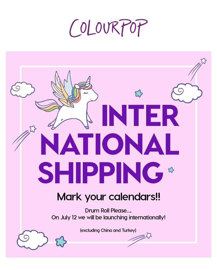 Colourpop goes international on July 12,2016!! ( excludes China and Turkey) Now almost the whole world can their lips, eyes, and face on Colourpop makeup. It will definitely make you popping and wallet pop outta money 😆 !