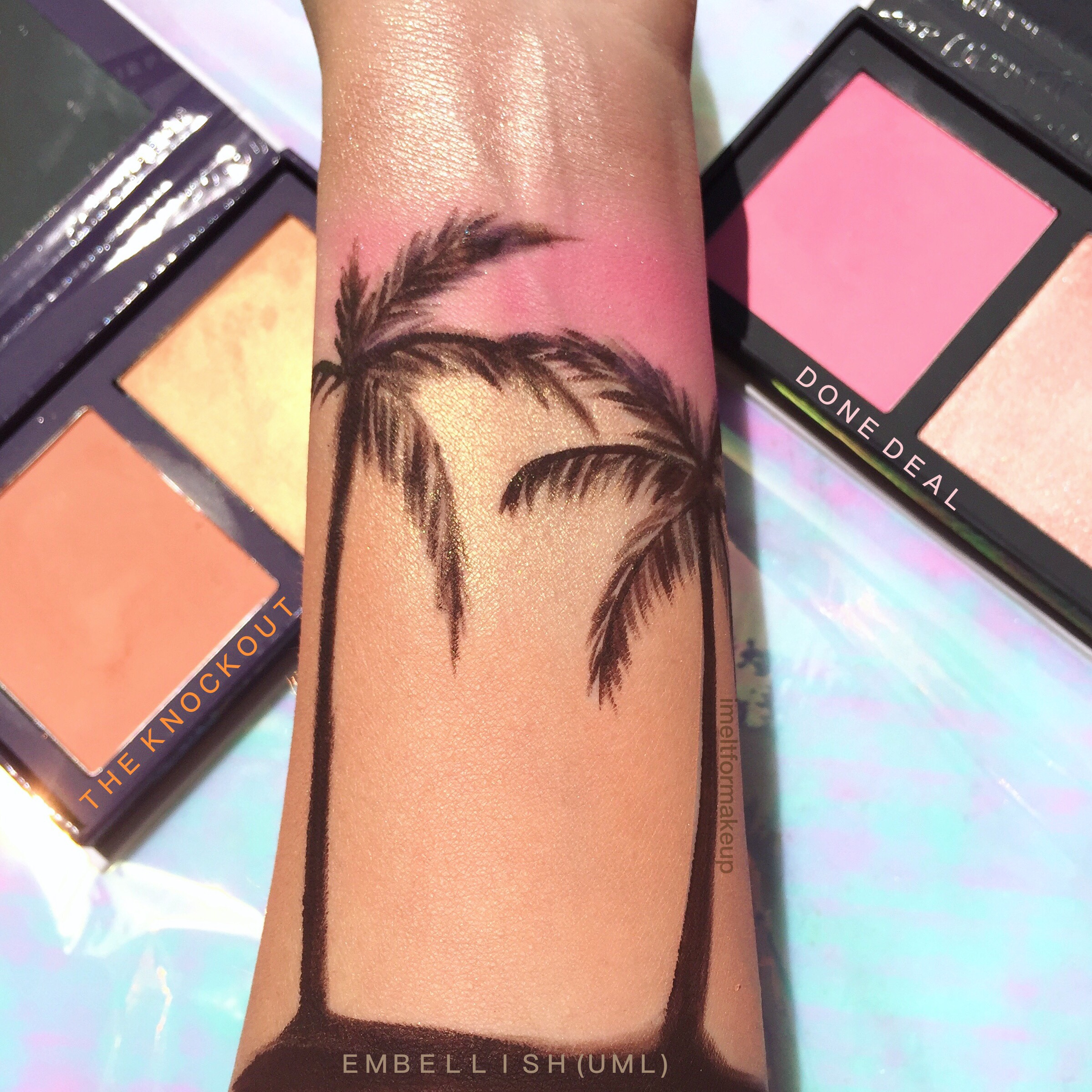 If you do not know I work in the bridal/ beauty makeup artistry sector. Many clients and because it’s quickly approaching from spring to summer, people are requesting a natural glow. After doing a monochromatic peach eye, lip, and cheeks (E.L.C.) look for one of my brides, per her request, I realized I did not have enough pastel nectar cheek colors. Instead, I used what I had, a pretty Colourpop eyeshadow on her cheeks (Colourpop Pressed Shadow “Wait For It”, their website picture does not represent how bright and coral-ly it actually is IRL, click for my swatch), it really complimented her NC15 skin. After that, I went on a binge buy of blushes and came across Colourpop’s blush duo in “Done Deal” & “The Knockout”. The knockout was a bit deeper than I like on my skin and not bright enough, as you can see in the swatches above. So the search continues (my nars order is on it’s way, and stila I need to test), stay in touch for more blush swatches or follow me on instagram: imeltformakeup, I update much more often there than here.