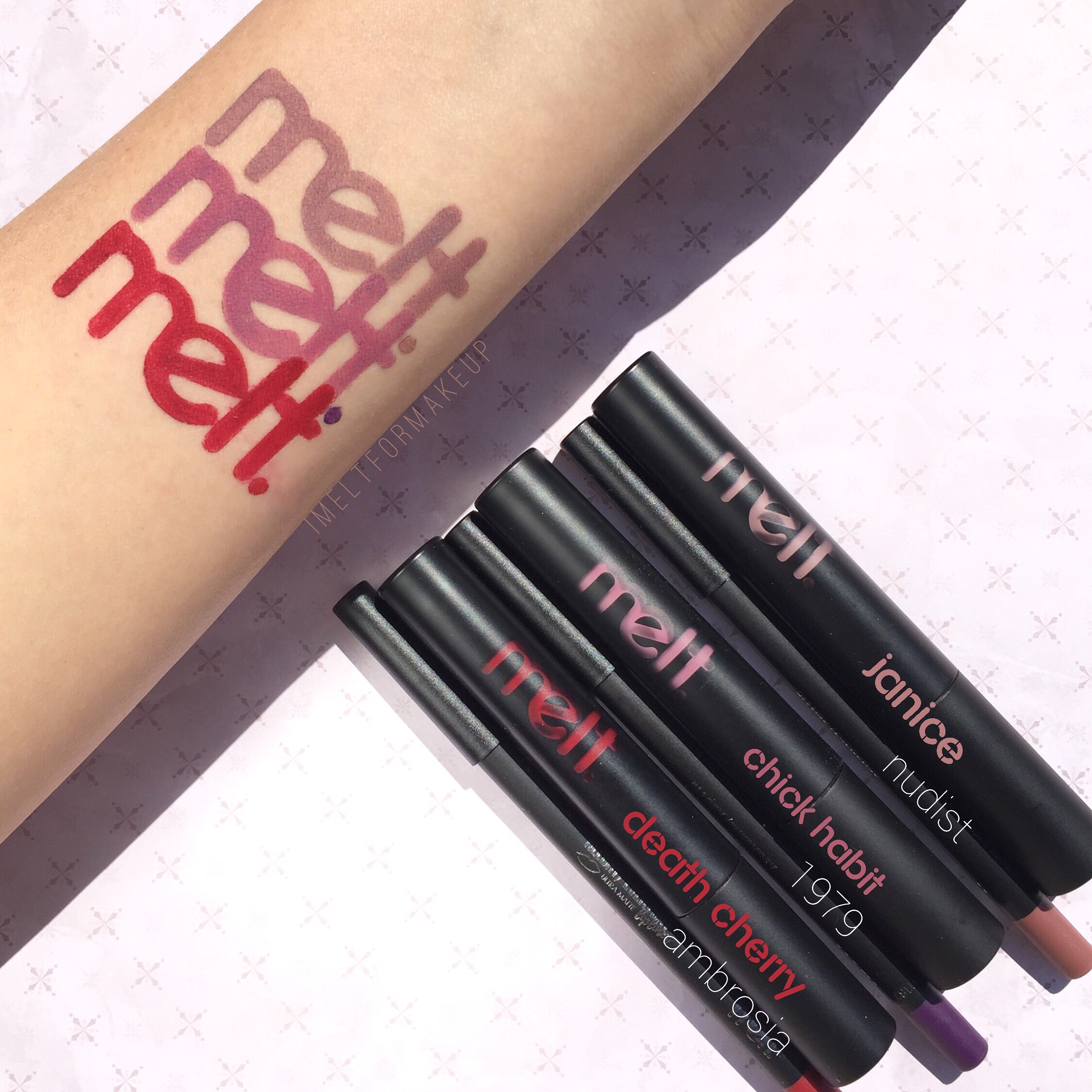 I was excited when Meltcosmetics slipped into my DMs about sending me products to try! 🙂 They sent me the newest colors (plus some other amazing products); death cherry + ambrosia liner, chick habit + 1979 liner, and janice + nudist liner that are to release tomorrow 9/29 Friday at 12pm. My favorite of the 3 is Death Cherry a beautiful blue toned deep ruby red. It is by far the most comfortable and true to color liquid lipstick in my collection. Feeling almost non-existent on my lips, I totally forgot I was wearing lipstick. The liquid lipsticks dry matte, transfer proof, but can be slightly smeared if not careful. There is no real scent to the liquid lipstick and the applicator is the perfect fluffy point with a center carriage that holds more product, so no need to dip over and over.