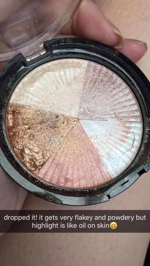 - Peachy pink highlighter: doesn’t really highlight, seems like a matte eye shadow with sparkles and not as pigmented as the others.